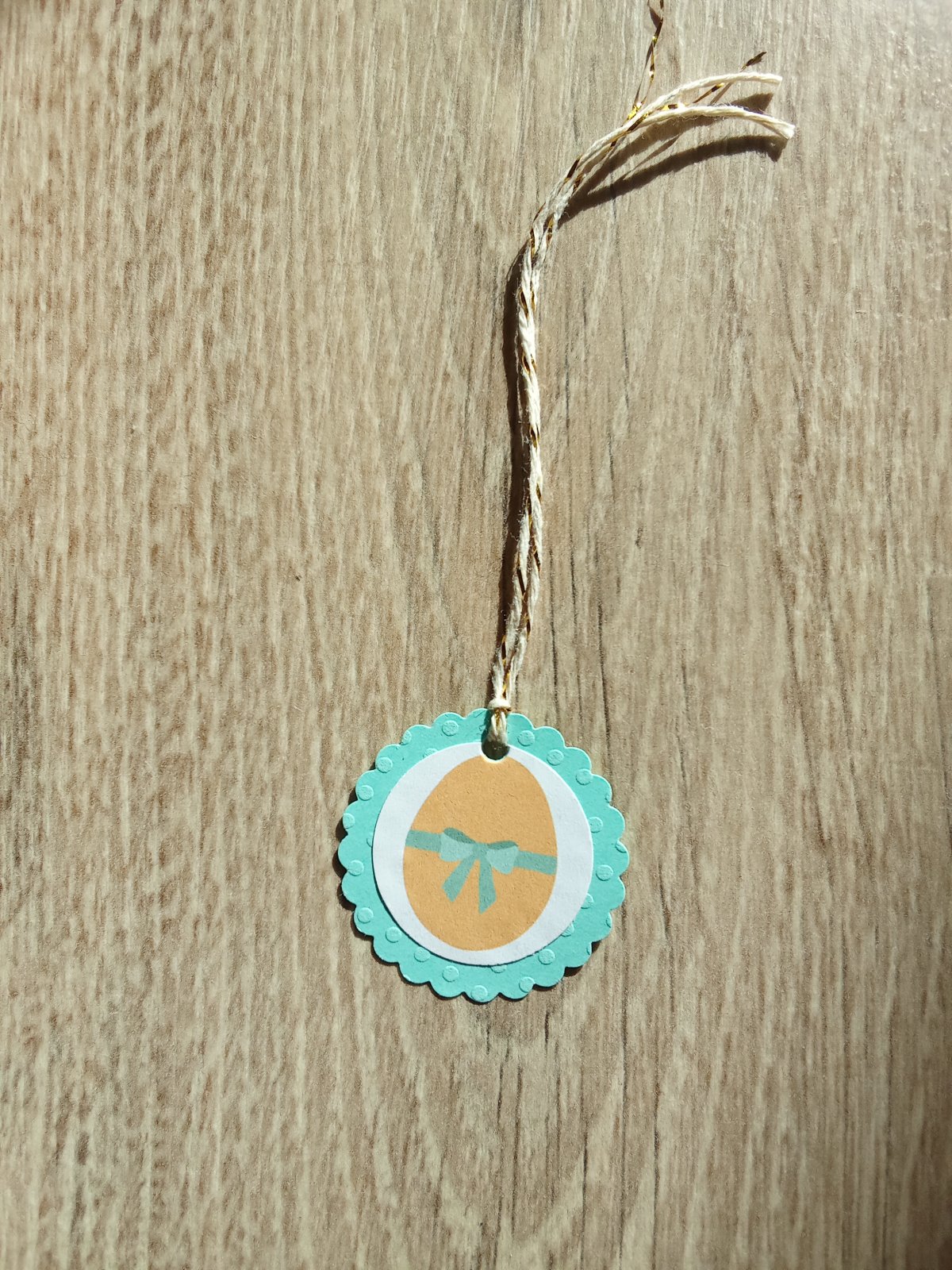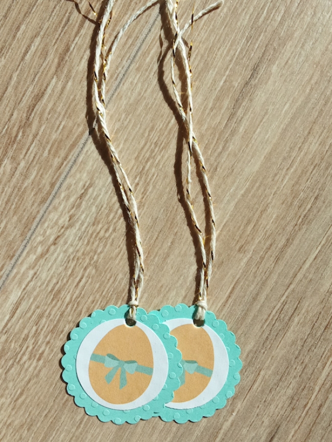 - 2 étiquettes cadeaux vertes à pois en relief en papier cartonné, recouvert d'un rond oeuf jaune avec un noeud vert.