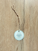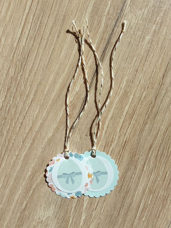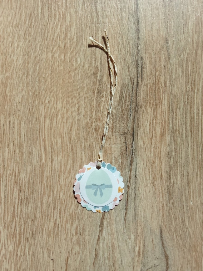 - 1 étiquette cadeaux fleuri en papier cartonné, recouvert d'un rond oeuf vert d'eau avec un noeud bleu.