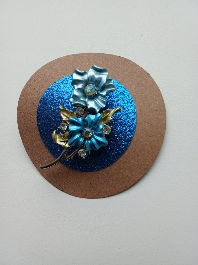 Description : une broche Fleurs en métal argenté, les deux fleurs sont 2 nuances d'émail bleu. Des strass sont positionnés au centre des fleurs et entre les feuilles.