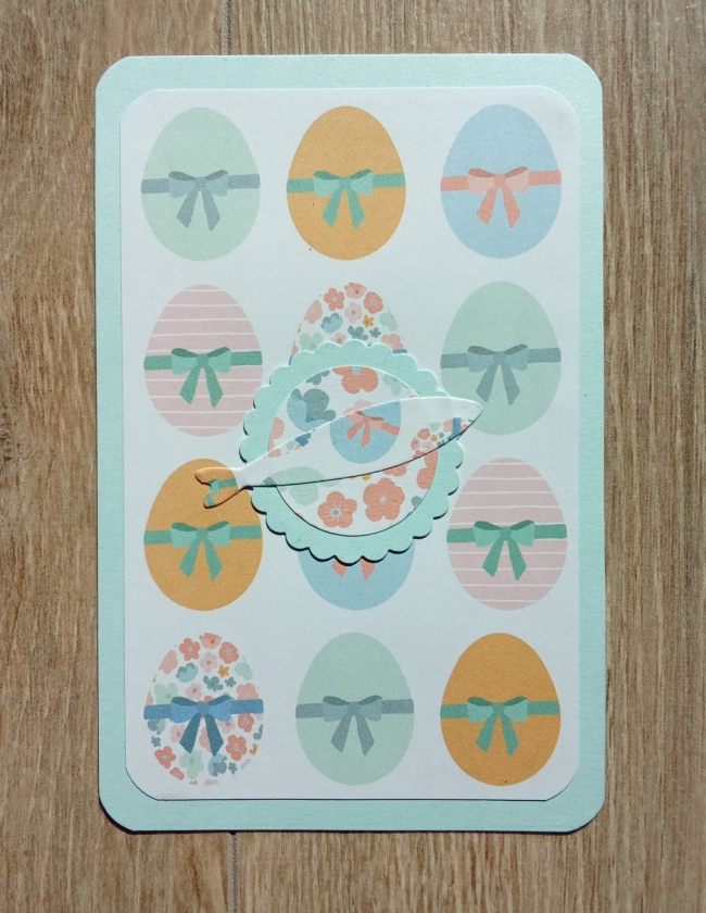 Description : une carte petit modèle en carton vert d'eau, bords arrondis, décoré d'un papier imprimé oeufs de Pâques tons pastels, agrémenté en son centre d'un écusson dentelé vert d'eau décoré d'un rond en papier imprimé fleuri et d'un poisson en papier imprimé oeufs de Pâques.