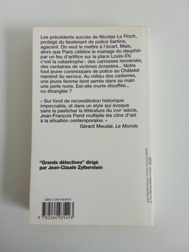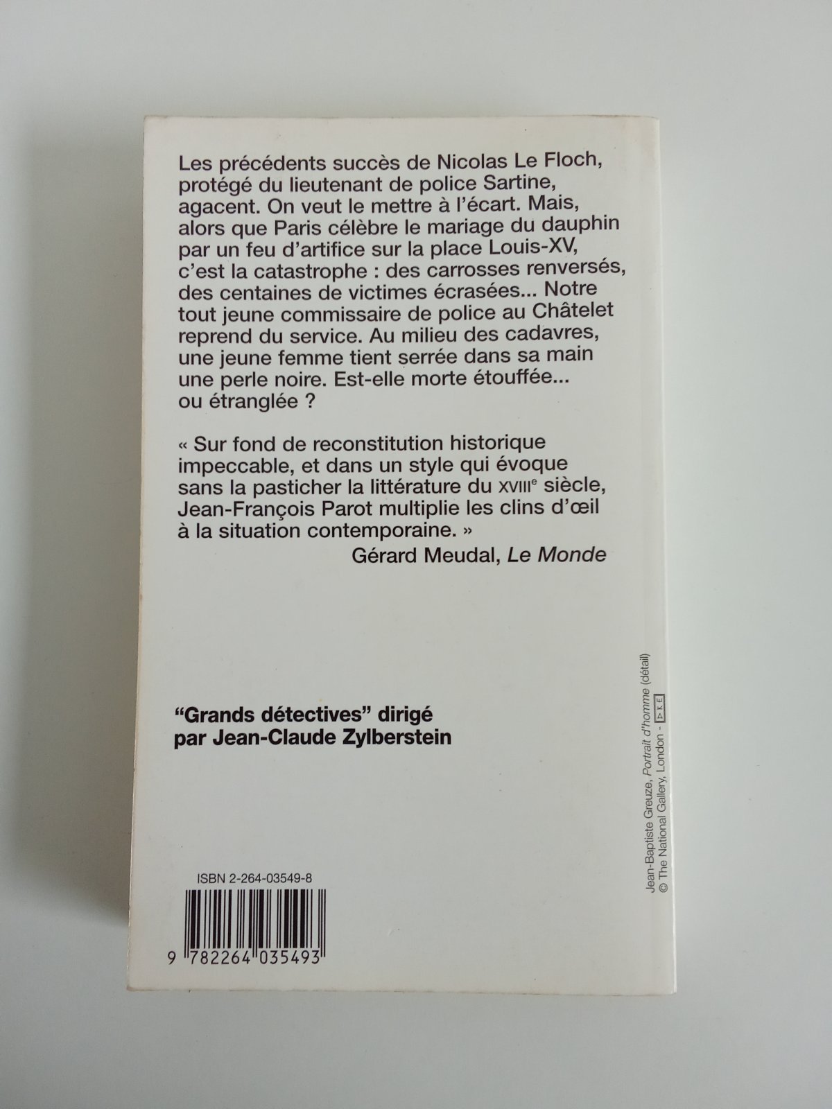 Résumé : Les précédents succès de Nicolas Le Floch, protégé du lieutenant de police Sartine, agacent. On veut le mettre à l'écart. Mais, alors que Paris célèbre le mariage du dauphin par un feu d'rtifice sur la place Louis XV, c'est la catastrophe : des carrosses renversés, des centaines de victimes écrasées... Notre tout jeune commissaire de police au Châtelet reprend du service. Au milieu des cadavres, une jeune femme tient serrée dans sa main une perle noire. Est-elle morte étouffée... ou étranglée ?