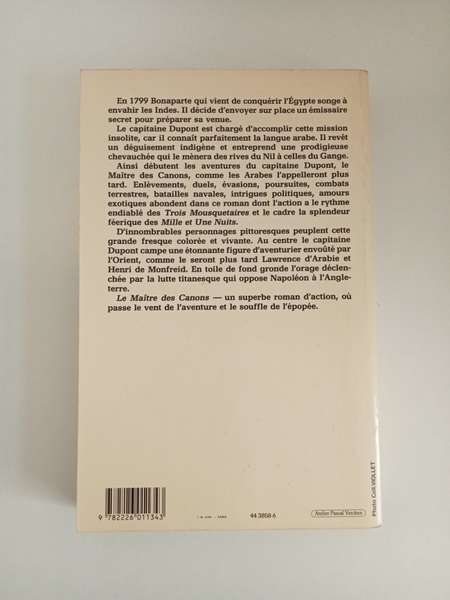 Ainsi débutent les aventures du capitaine Dupont, le Maître des Canons, comme les arabes l'apelleront plus tard. Enlèvements, duels, évasions, poursuites, combats terrestres, batailles navales, intrigues politiques, amours exotiques abondent dans ce roman dont l'action a le rythme endiablé des Trois Mousquetaires et le cadre la splendeur féerique des Mille et Une Nuits.