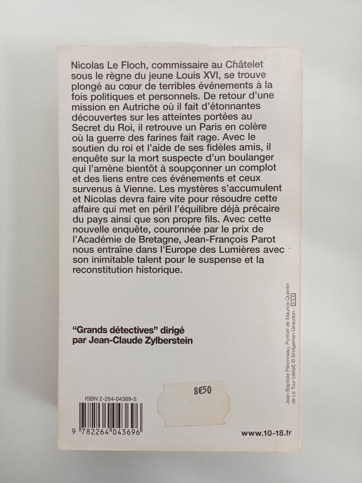 Résumé : Nicolas Le Floch, commissaire au Châtelet sous le règne du jeune Louis XVI, se trouve plongé au coeur de terribles évènements à la fois politiques et personnels. De retour d'une mission en Autriche où il fait d'étonnantes découvertes sur les atteintes portées au Secret du Roi, il retrouve un Paris en colère où la guerre des farines fait rage. Avec le soutien du roi et l'aide de ses fidèles amis, il enquête sur la mort suspecte d'un boulanger qui l'amène bientôt à soupçonner un complot et des liens entre ces évènements et ceux survenus à Vienne. Les mystères s'accumulent et Nicolas devra faire vite pour résoudre cette affaire qui met en péril l'équilibre déjà précaire du pays ainsi que son propre fils. Avec cette nouvelle enquête, couronnée par le prix de l'Académie de Bretagne, Jean-François Parot nous entraîne dans l'Europe des Lumières avec son inimitable talent pour le suspense et la reconstitution historique.