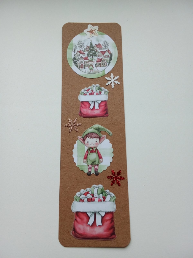 Description : un marque page en carton kraft "Lutin de Noël", un décor contenant des sac de cadeaux, des flocons de neige pailletés rouge, blanc et or et un mignon lutin facétieux.