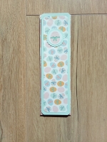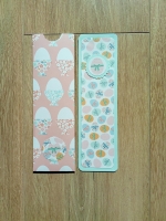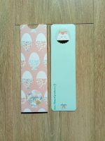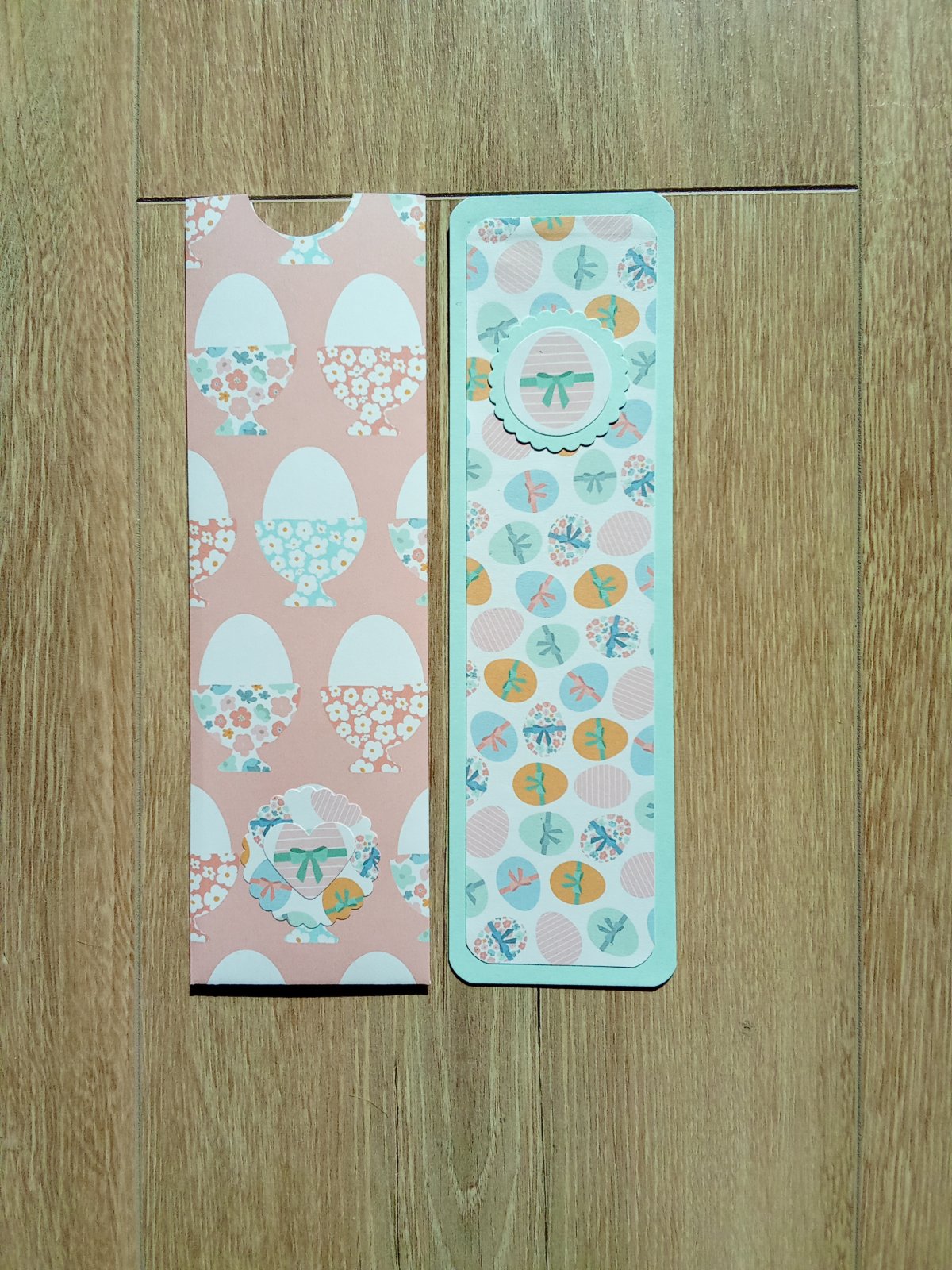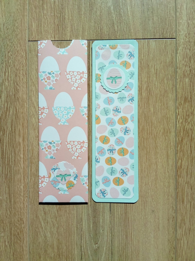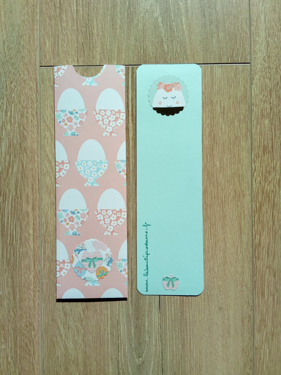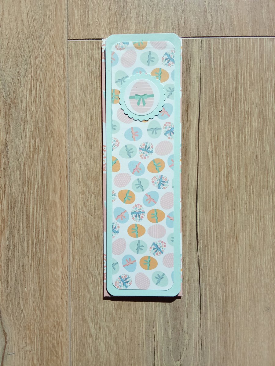 Description : un marque page grand modèle en carton vert d'eau, bords arrondis, décoré d'un papier imprimé oeufs de Pâques tons pastels, un oeuf rayé rose décoré d'un noeud vert.