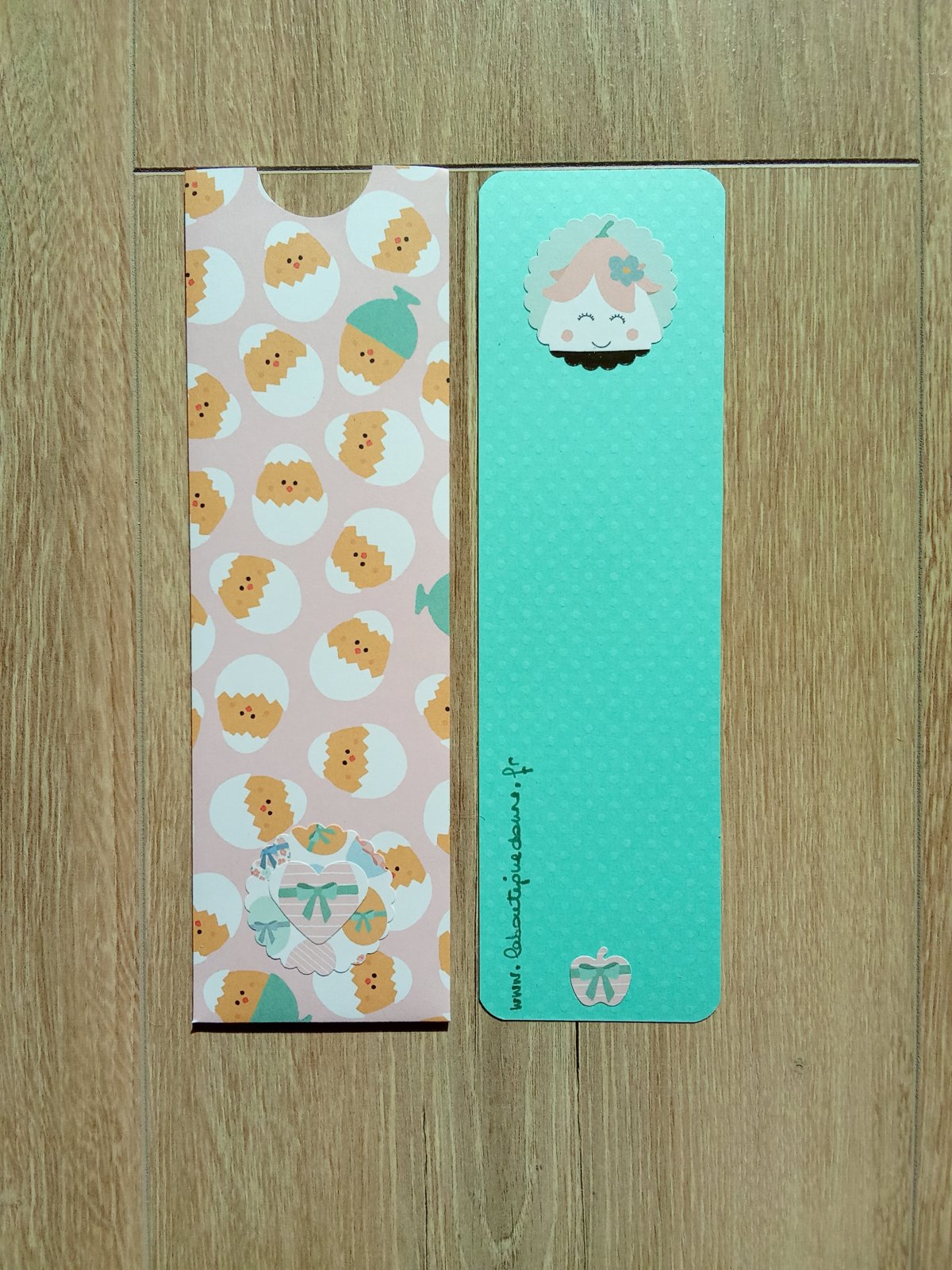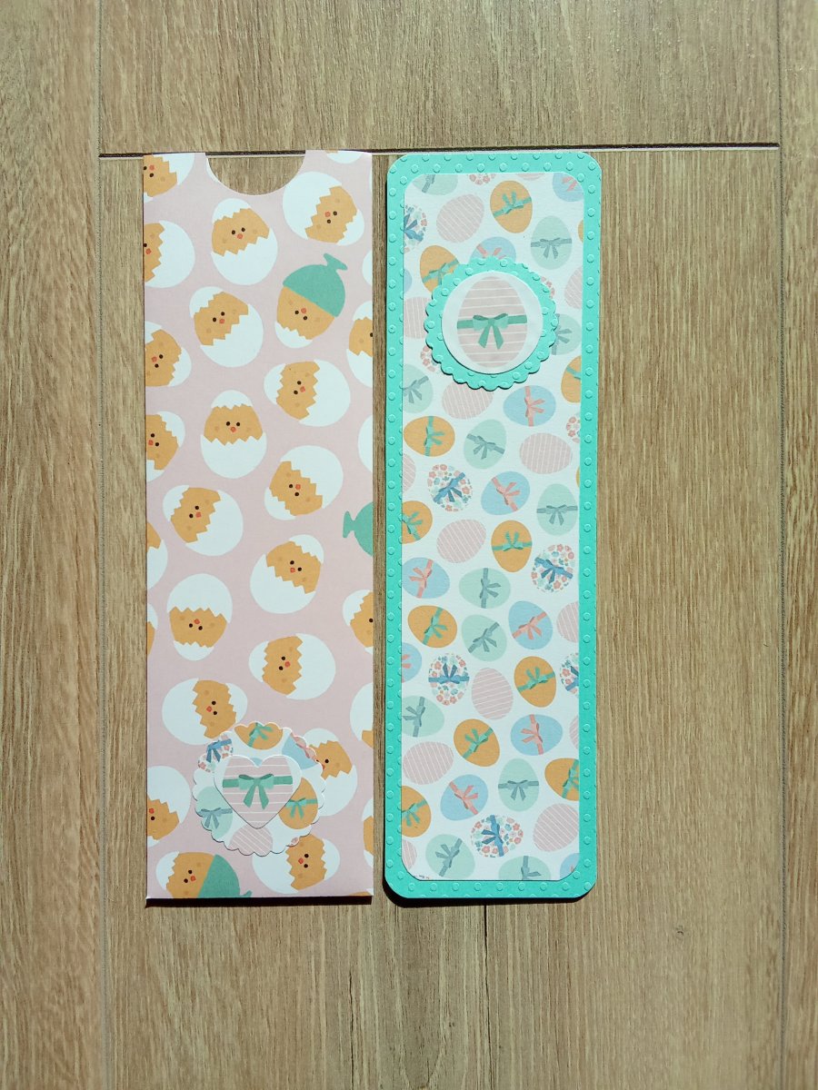 Glissé dans une pochette cartonnée décor oeufs de Pâques fond rose + un écusson dentelé imprimé oeufs de Pâques.