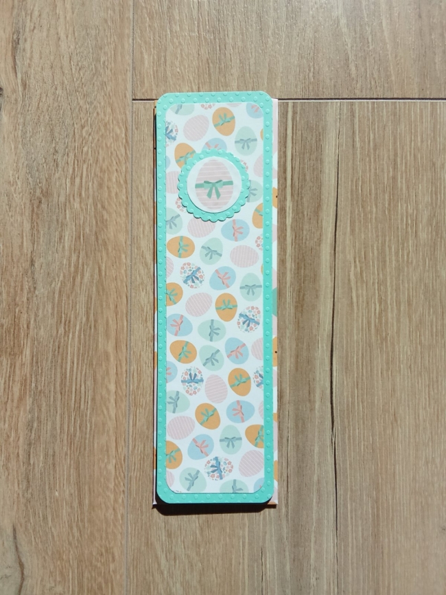 Description : un marque page grand modèle en carton vert à pois en relief, bords arrondis, décoré d'un papier imprimé oeufs de Pâques tons pastels, un oeuf rayé rose décoré d'un noeud vert.