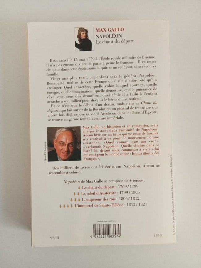 Auteur : Max GALLO, en historien et en romancier, est à chaque instant dans l'intimité de Napoléon. Aucun livre sur un héros qui ne cesse de fasciner n'a restitué à ce point le mouvement d'une existence. "Quel roman que ma vie ! " s'exclamait Napoléon. Quelle vitalité dans ce livre ! Ici, devant nous, commence à vivre celui qui reste pour le monde entier "le plus illustre des français".