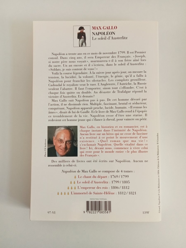 Auteur : Max GALLO, en historien et en romancier, est à chaque instant dans l'intimité de Napoléon. Aucun livre sur un héros qui ne cesse de fasciner n'a restitué à ce point le mouvement d'une existence. "Quel roman que ma vie ! " s'exclamait Napoléon. Quelle vitalité dans ce livre ! Ici, devant nous, commence à vivre celui qui reste pour le monde entier "le plus illustre des français".