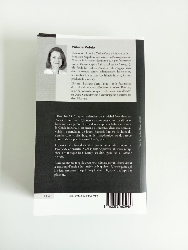 Auteur : Valérie Valeix, passionnée d'Histoire, elle a été membre de la Fondation Napoléon. A la suite d'un déménagement en Normandie, intéressée depuis toujours par l'apiculture (son arrière-grand-père était apiculteur en Auvergne), elle fonde les ruchers d'Audrey. Elle s'engage alors dans le combat contre l'effondrement des colonies, la "malbouffe" et dans l'apithérapie (soins grâce aux produits de la ruche).
